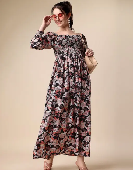 Easy and elegant, Floral print this skater dress to give your closet an effortless sartorial update. Tailored in a swiss dotted fabric, the dress features a smocking detail and ruffles along the hem .it come with long puff sleeves. Style Tip : Complete the look with heels and a ting sling.