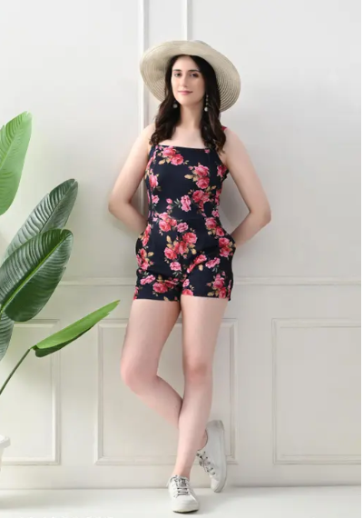 Elevate your summer style with this vibrant jumpsuit featuring a chic floral print. Designed for ultimate comfort, it has straps and practical side pockets. Perfect for casual outings or beach days, this stylish outfit effortlessly combines elegance and relaxation for a trendy summer look.